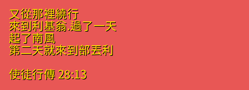 今日分享的中文聖經:「又從那裡繞行、來到利基翁.過了一天、起了南風、第二天就來到部丟利。」來自聖經「使徒行傳」第「28章13節」,你可以繼續向下拉看到聖經卷書完整章節。每日中文聖經從神的話語中聆聽神的聲音,引導我們的人生,指導我們人生的方向,讓我們做出正確的選擇,而做出這些正確選擇的原則都在聖經中,所以我們需要讀神的話語,認識他的話語,把神的話語藏在心裡。