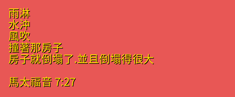 今日分享的中文聖經:「雨淋、水沖、風吹、撞著那房子、房子就倒塌了.並且倒塌得很大。」來自聖經「馬太福音」第「7章27節」,你可以繼續向下拉看到聖經卷書完整章節。每日中文聖經從神的話語中聆聽神的聲音,引導我們的人生,指導我們人生的方向,讓我們做出正確的選擇,而做出這些正確選擇的原則都在聖經中,所以我們需要讀神的話語,認識他的話語,把神的話語藏在心裡。