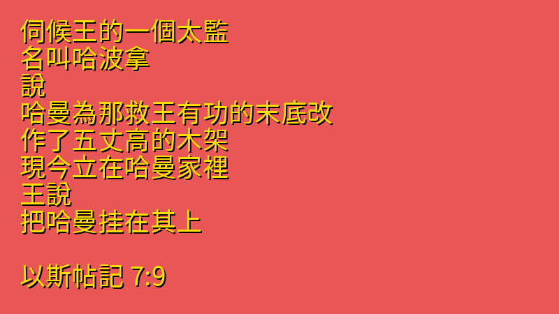 今日分享的中文聖經:「伺候王的一個太監、名叫哈波拿、說、哈曼為那救王有功的末底改、作了五丈高的木架、現今立在哈曼家裡.王說、把哈曼挂在其上。」來自聖經「以斯帖記」第「7章9節」,你可以繼續向下拉看到聖經卷書完整章節。每日中文聖經從神的話語中聆聽神的聲音,引導我們的人生,指導我們人生的方向,讓我們做出正確的選擇,而做出這些正確選擇的原則都在聖經中,所以我們需要讀神的話語,認識他的話語,把神的話語藏在心裡。
