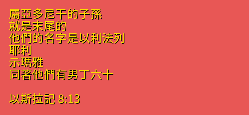 今日分享的中文聖經:「屬亞多尼干的子孫、就是末尾的、他們的名字是以利法列、耶利、示瑪雅.同著他們有男丁六十。」來自聖經「以斯拉記」第「8章13節」,你可以繼續向下拉看到聖經卷書完整章節。每日中文聖經從神的話語中聆聽神的聲音,引導我們的人生,指導我們人生的方向,讓我們做出正確的選擇,而做出這些正確選擇的原則都在聖經中,所以我們需要讀神的話語,認識他的話語,把神的話語藏在心裡。
