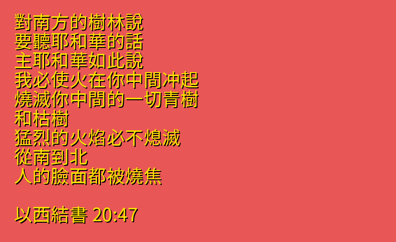 對南方的樹林說、要聽耶和華的話.主耶和華如此說、我必使火在你中間冲起、燒滅你中間的一切青樹、和枯樹、猛烈的火焰必不熄滅.從南到北、人的臉面都被燒焦。