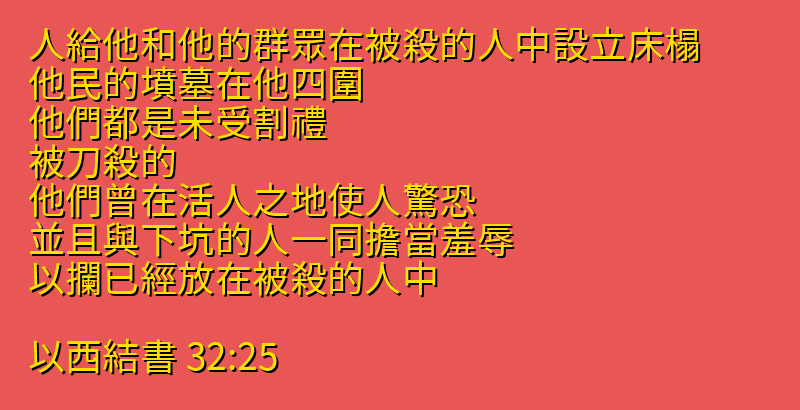 人給他和他的群眾在被殺的人中設立床榻.他民的墳墓在他四圍.他們都是未受割禮、被刀殺的.他們曾在活人之地使人驚恐.並且與下坑的人一同擔當羞辱.以攔已經放在被殺的人中。