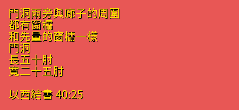 門洞兩旁與廊子的周圍、都有窗櫺、和先量的窗櫺一樣.門洞、長五十肘、寬二十五肘。