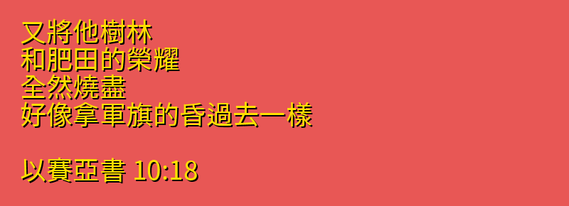 又將他樹林、和肥田的榮耀、全然燒盡.好像拿軍旗的昏過去一樣。