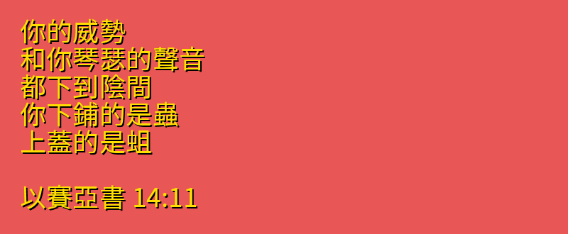 你的威勢、和你琴瑟的聲音、都下到陰間.你下鋪的是蟲、上蓋的是蛆。
