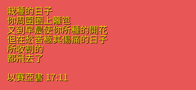 栽種的日子、你周圍圈上籬笆、又到早晨使你所種的開花.但在愁苦極其傷痛的日子、所收割的、都飛去了。