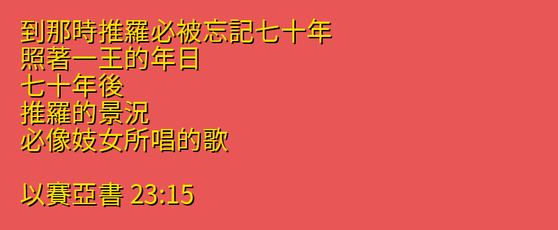 到那時推羅必被忘記七十年、照著一王的年日.七十年後、推羅的景況、必像妓女所唱的歌。