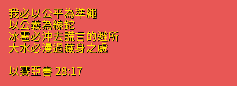 我必以公平為準繩、以公義為線鉈.冰雹必沖去謊言的避所、大水必漫過藏身之處。