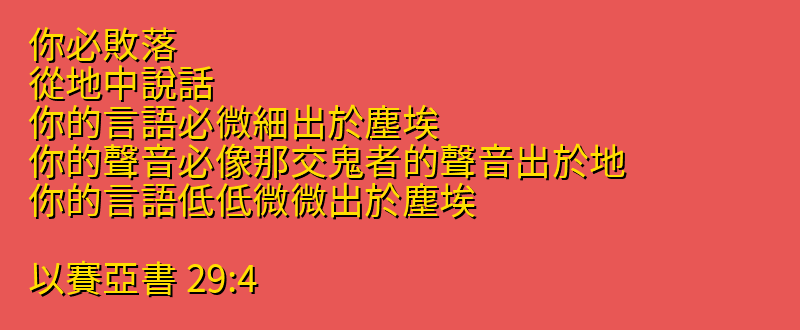 你必敗落、從地中說話.你的言語必微細出於塵埃.你的聲音必像那交鬼者的聲音出於地.你的言語低低微微出於塵埃。