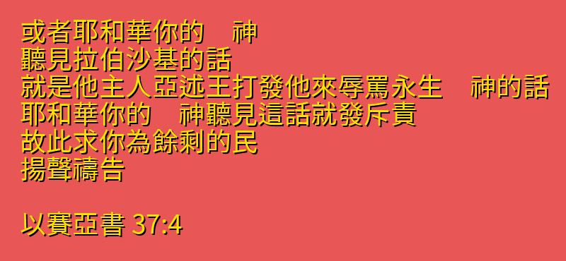 或者耶和華你的 神、聽見拉伯沙基的話、就是他主人亞述王打發他來辱罵永生 神的話.耶和華你的 神聽見這話就發斥責.故此求你為餘剩的民、揚聲禱告。