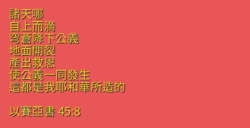 諸天哪、自上而滴.穹蒼降下公義、地面開裂、產出救恩、使公義一同發生、這都是我耶和華所造的。