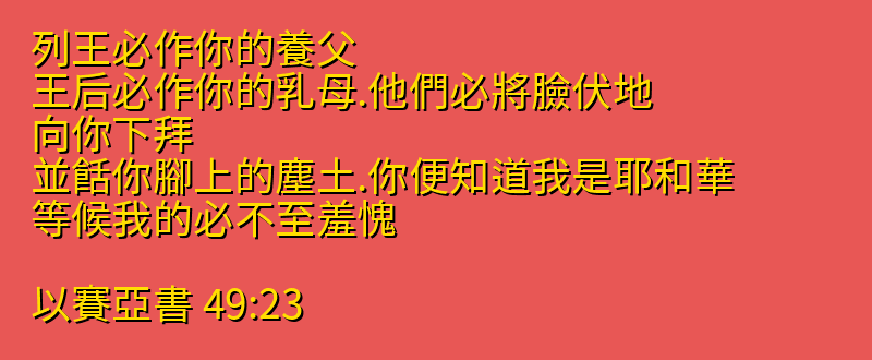 列王必作你的養父、王后必作你的乳母.他們必將臉伏地、向你下拜、並餂你腳上的塵土.你便知道我是耶和華、等候我的必不至羞愧。