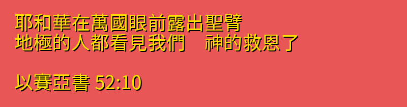 • 52:10 耶和華在萬國眼前露出聖臂.地極的人都看見我們 神的救恩了。