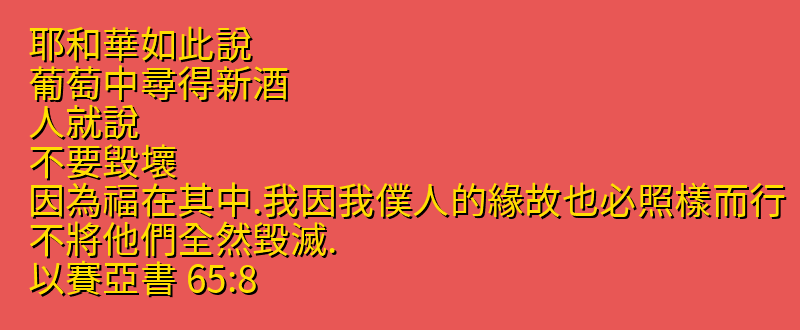 耶和華如此說、葡萄中尋得新酒、人就說、不要毀壞、因為福在其中.我因我僕人的緣故也必照樣而行、不將他們全然毀滅.