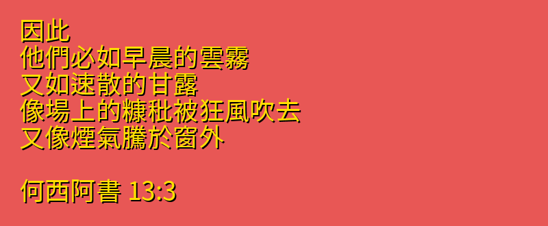 今日分享的中文聖經:「因此、他們必如早晨的雲霧、又如速散的甘露、像場上的糠秕被狂風吹去、又像煙氣騰於窗外。」來自聖經「何西阿書」第「13章3節」,你可以繼續向下拉看到聖經卷書完整章節。每日中文聖經從神的話語中聆聽神的聲音,引導我們的人生,指導我們人生的方向,讓我們做出正確的選擇,而做出這些正確選擇的原則都在聖經中,所以我們需要讀神的話語,認識他的話語,把神的話語藏在心裡。
