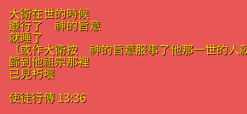 今日分享的中文聖經:「大衛在世的時候、遵行了 神的旨意、就睡了、〔或作大衛按 神的旨意服事了他那一世的人就睡了〕歸到他祖宗那裡、已見朽壞.」來自聖經「使徒行傳」第「13章36節」,你可以繼續向下拉看到聖經卷書完整章節。每日中文聖經從神的話語中聆聽神的聲音,引導我們的人生,指導我們人生的方向,讓我們做出正確的選擇,而做出這些正確選擇的原則都在聖經中,所以我們需要讀神的話語,認識他的話語,把神的話語藏在心裡。