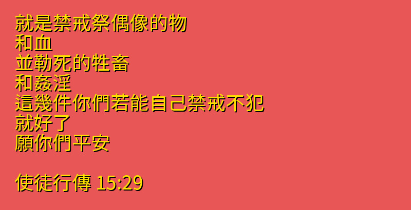 • 15:29 就是禁戒祭偶像的物、和血、並勒死的牲畜、和姦淫.這幾件你們若能自己禁戒不犯、就好了.願你們平安。