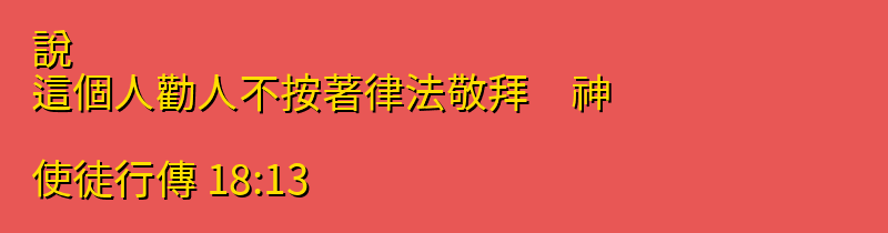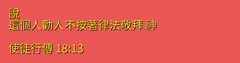 今日分享的中文聖經:「說、這個人勸人不按著律法敬拜 神。」來自聖經「使徒行傳」第「18章13節」,你可以繼續向下拉看到聖經卷書完整章節。每日中文聖經從神的話語中聆聽神的聲音,引導我們的人生,指導我們人生的方向,讓我們做出正確的選擇,而做出這些正確選擇的原則都在聖經中,所以我們需要讀神的話語,認識他的話語,把神的話語藏在心裡。