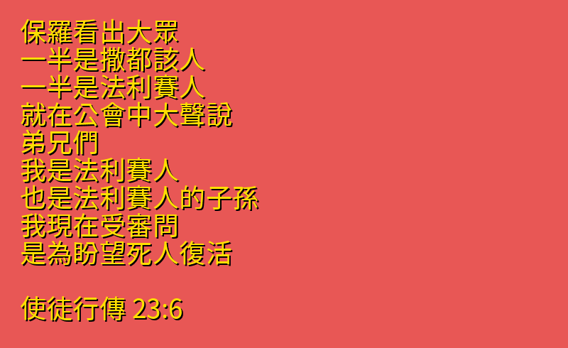 保羅看出大眾、一半是撒都該人、一半是法利賽人、就在公會中大聲說、弟兄們、我是法利賽人、也是法利賽人的子孫.我現在受審問、是為盼望死人復活。