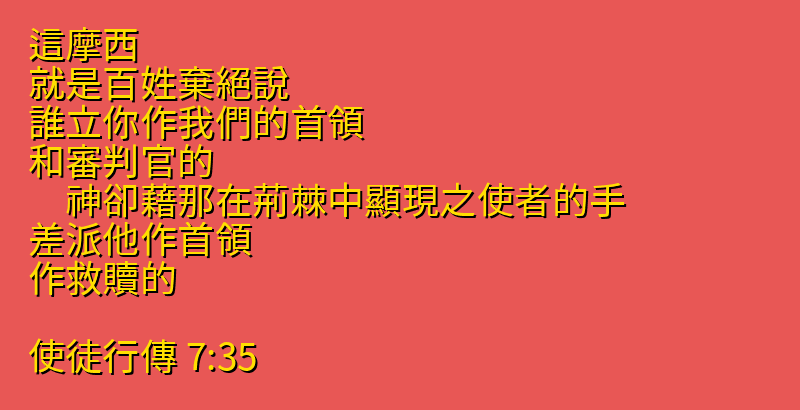 • 7:35 這摩西、就是百姓棄絕說、誰立你作我們的首領、和審判官的. 神卻藉那在荊棘中顯現之使者的手、差派他作首領、作救贖的。