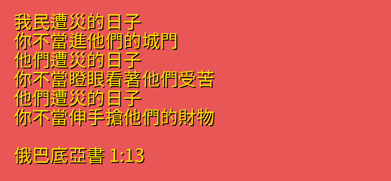 我民遭災的日子、你不當進他們的城門.他們遭災的日子、你不當瞪眼看著他們受苦.他們遭災的日子、你不當伸手搶他們的財物。