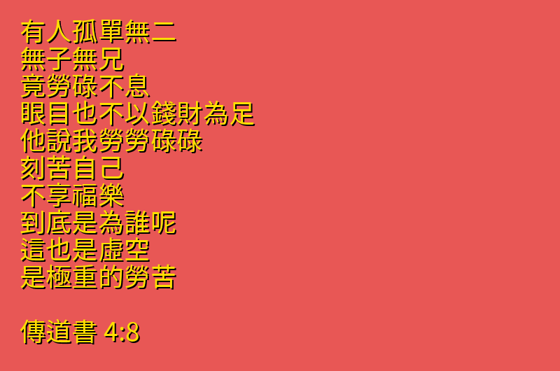 有人孤單無二、無子無兄、竟勞碌不息、眼目也不以錢財為足.他說我勞勞碌碌、刻苦自己、不享福樂、到底是為誰呢.這也是虛空、是極重的勞苦。