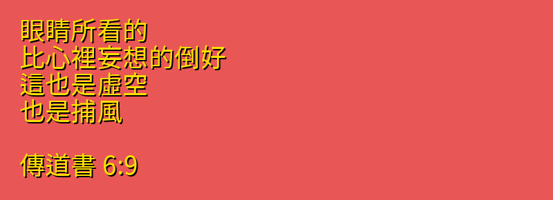 今日分享的中文聖經:「眼睛所看的、比心裡妄想的倒好.這也是虛空、也是捕風。」來自聖經「傳道書」第「6章9節」,你可以繼續向下拉看到聖經卷書完整章節。每日中文聖經從神的話語中聆聽神的聲音,引導我們的人生,指導我們人生的方向,讓我們做出正確的選擇,而做出這些正確選擇的原則都在聖經中,所以我們需要讀神的話語,認識他的話語,把神的話語藏在心裡。