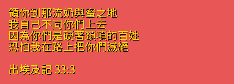 今日分享的中文聖經:「領你到那流奶與蜜之地.我自己不同你們上去、因為你們是硬著頸項的百姓、恐怕我在路上把你們滅絕。」來自聖經「出埃及記」第「33章3節」,你可以繼續向下拉看到聖經卷書完整章節。每日中文聖經從神的話語中聆聽神的聲音,引導我們的人生,指導我們人生的方向,讓我們做出正確的選擇,而做出這些正確選擇的原則都在聖經中,所以我們需要讀神的話語,認識他的話語,把神的話語藏在心裡。
