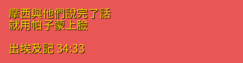 今日分享的中文聖經:「摩西與他們說完了話、就用帕子蒙上臉。」來自聖經「出埃及記」第「34章33節」,你可以繼續向下拉看到聖經卷書完整章節。每日中文聖經從神的話語中聆聽神的聲音,引導我們的人生,指導我們人生的方向,讓我們做出正確的選擇,而做出這些正確選擇的原則都在聖經中,所以我們需要讀神的話語,認識他的話語,把神的話語藏在心裡。