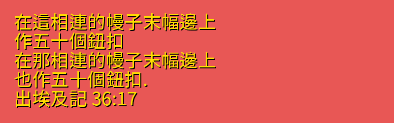 • 36:17 在這相連的幔子末幅邊上、作五十個鈕扣、在那相連的幔子末幅邊上、也作五十個鈕扣.