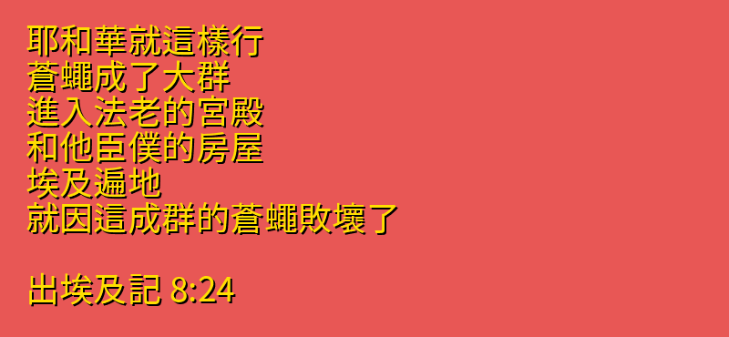 耶和華就這樣行、蒼蠅成了大群、進入法老的宮殿、和他臣僕的房屋.埃及遍地、就因這成群的蒼蠅敗壞了。