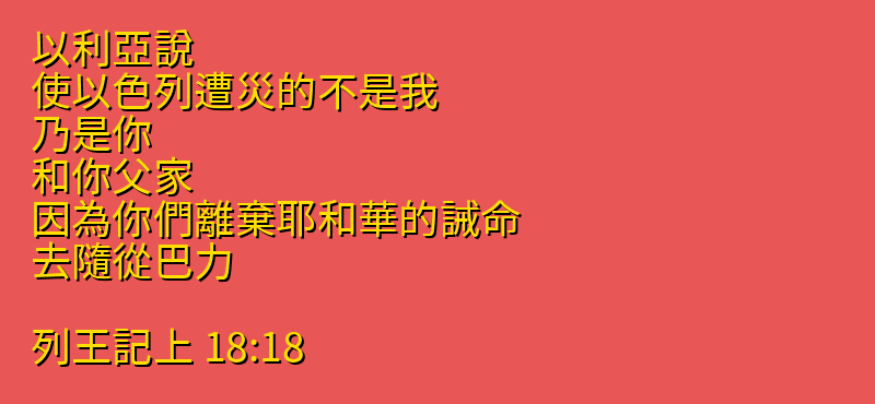 以利亞說、使以色列遭災的不是我、乃是你、和你父家、因為你們離棄耶和華的誡命、去隨從巴力。