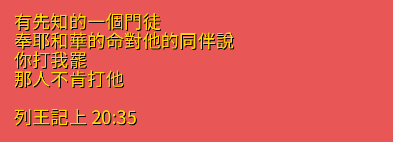 今日分享的中文聖經:「有先知的一個門徒、奉耶和華的命對他的同伴說、你打我罷.那人不肯打他.」來自聖經「列王記上」第「20章35節」,你可以繼續向下拉看到聖經卷書完整章節。每日中文聖經從神的話語中聆聽神的聲音,引導我們的人生,指導我們人生的方向,讓我們做出正確的選擇,而做出這些正確選擇的原則都在聖經中,所以我們需要讀神的話語,認識他的話語,把神的話語藏在心裡。