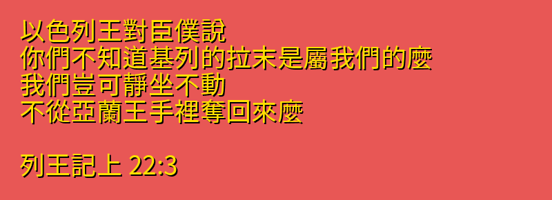 以色列王對臣僕說、你們不知道基列的拉末是屬我們的麼、我們豈可靜坐不動、不從亞蘭王手裡奪回來麼。