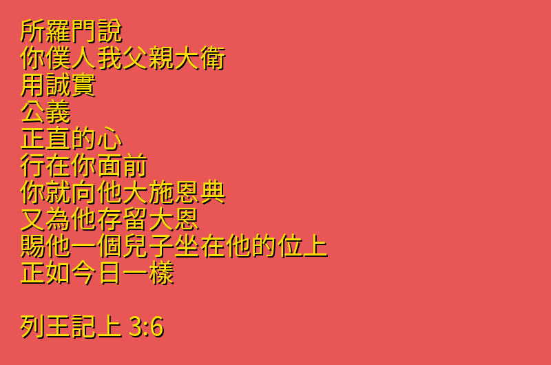 所羅門說、你僕人我父親大衛、用誠實、公義、正直的心、行在你面前、你就向他大施恩典.又為他存留大恩、賜他一個兒子坐在他的位上、正如今日一樣。