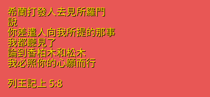 今日分享的中文聖經:「希蘭打發人去見所羅門、說、你差遣人向我所提的那事、我都聽見了.論到香柏木和松木、我必照你的心願而行。」來自聖經「列王記上」第「5章8節」,你可以繼續向下拉看到聖經卷書完整章節。每日中文聖經從神的話語中聆聽神的聲音,引導我們的人生,指導我們人生的方向,讓我們做出正確的選擇,而做出這些正確選擇的原則都在聖經中,所以我們需要讀神的話語,認識他的話語,把神的話語藏在心裡。