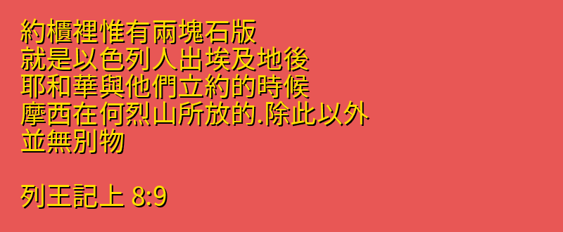 約櫃裡惟有兩塊石版、就是以色列人出埃及地後、耶和華與他們立約的時候、摩西在何烈山所放的.除此以外、並無別物。