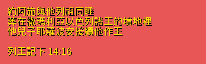 今日分享的中文聖經:「約阿施與他列祖同睡、葬在撒瑪利亞以色列諸王的墳地裡.他兒子耶羅波安接續他作王。」來自聖經「列王記下」第「14章16節」,你可以繼續向下拉看到聖經卷書完整章節。每日中文聖經從神的話語中聆聽神的聲音,引導我們的人生,指導我們人生的方向,讓我們做出正確的選擇,而做出這些正確選擇的原則都在聖經中,所以我們需要讀神的話語,認識他的話語,把神的話語藏在心裡。