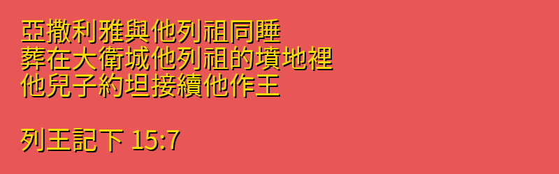• 15:7 亞撒利雅與他列祖同睡、葬在大衛城他列祖的墳地裡.他兒子約坦接續他作王。