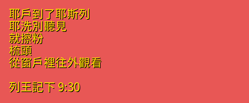 • 9:30 耶戶到了耶斯列、耶洗別聽見、就擦粉、梳頭、從窗戶裡往外觀看。