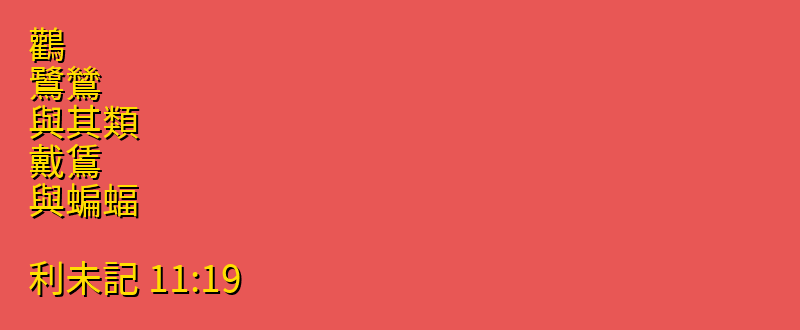 今日分享的中文聖經:「鸛、鷺鷥、與其類.戴鵀、與蝙蝠。」來自聖經「利未記」第「11章19節」,你可以繼續向下拉看到聖經卷書完整章節。每日中文聖經從神的話語中聆聽神的聲音,引導我們的人生,指導我們人生的方向,讓我們做出正確的選擇,而做出這些正確選擇的原則都在聖經中,所以我們需要讀神的話語,認識他的話語,把神的話語藏在心裡。