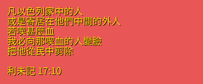 • 17:10 凡以色列家中的人、或是寄居在他們中間的外人、若喫甚麼血、我必向那喫血的人變臉、把他從民中剪除。