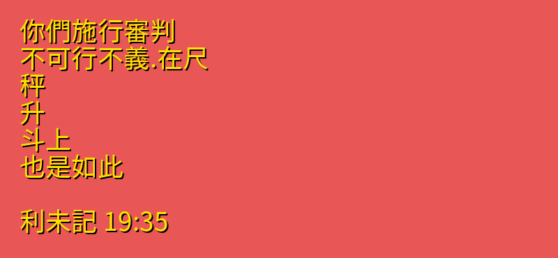 今日分享的中文聖經:「你們施行審判、不可行不義.在尺、秤、升、斗上、也是如此。」來自聖經「利未記」第「19章35節」,你可以繼續向下拉看到聖經卷書完整章節。每日中文聖經從神的話語中聆聽神的聲音,引導我們的人生,指導我們人生的方向,讓我們做出正確的選擇,而做出這些正確選擇的原則都在聖經中,所以我們需要讀神的話語,認識他的話語,把神的話語藏在心裡。