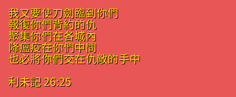 今日分享的中文聖經:「我又要使刀劍臨到你們、報復你們背約的仇.聚集你們在各城內、降瘟疫在你們中間、也必將你們交在仇敵的手中。」來自聖經「利未記」第「26章25節」,你可以繼續向下拉看到聖經卷書完整章節。每日中文聖經從神的話語中聆聽神的聲音,引導我們的人生,指導我們人生的方向,讓我們做出正確的選擇,而做出這些正確選擇的原則都在聖經中,所以我們需要讀神的話語,認識他的話語,把神的話語藏在心裡。