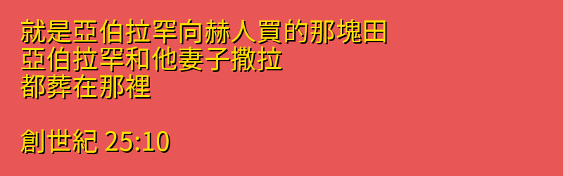今日分享的中文聖經:「就是亞伯拉罕向赫人買的那塊田.亞伯拉罕和他妻子撒拉、都葬在那裡。」來自聖經「創世紀」第「25章10節」,你可以繼續向下拉看到聖經卷書完整章節。每日中文聖經從神的話語中聆聽神的聲音,引導我們的人生,指導我們人生的方向,讓我們做出正確的選擇,而做出這些正確選擇的原則都在聖經中,所以我們需要讀神的話語,認識他的話語,把神的話語藏在心裡。