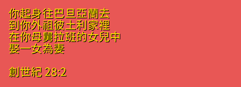 你起身往巴旦亞蘭去、到你外祖彼土利家裡、在你母舅拉班的女兒中、娶一女為妻。