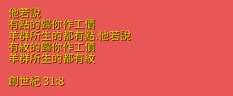 • 31:8 他若說、有點的歸你作工價、羊群所生的都有點.他若說、有紋的歸你作工價、羊群所生的都有紋。