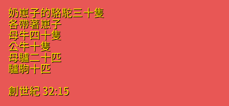 奶崽子的駱駝三十隻、各帶著崽子、母牛四十隻、公牛十隻、母驢二十匹、驢駒十匹.