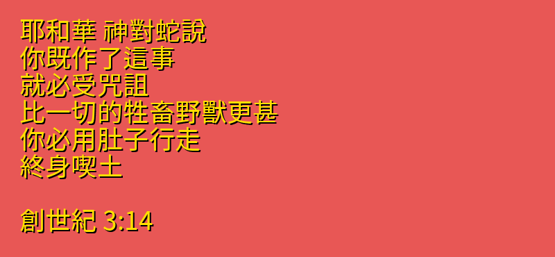 耶和華 神對蛇說、你既作了這事、就必受咒詛、比一切的牲畜野獸更甚、你必用肚子行走、終身喫土。