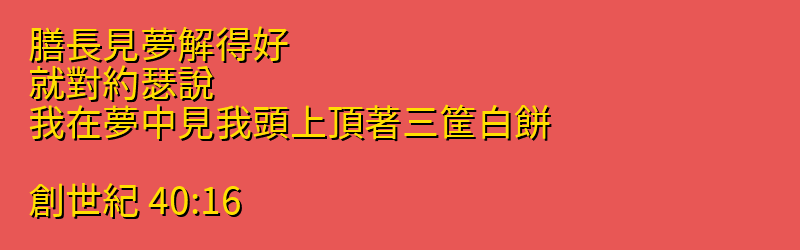 • 40:16 膳長見夢解得好、就對約瑟說、我在夢中見我頭上頂著三筐白餅.